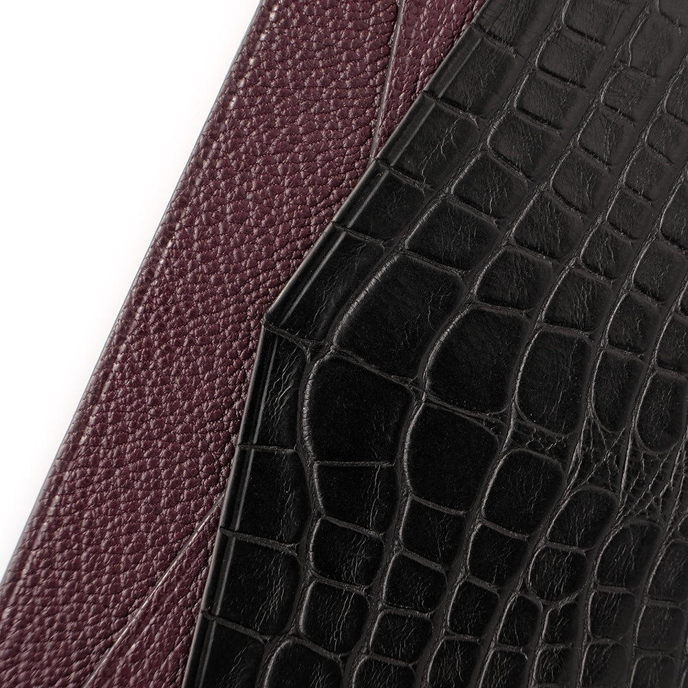 على الرغم من أن آنه مبطنة بجلد الماعز الفاخر، بإمكانكم اختيار نوع الفتحات الخلفية إما من جلد العجل أو جلد الماعز بألوانه المختلفة، كما يمكنكم اختيار أي نوع من أنواع الجلود الفريدة من نوعها في فتحة البطاقة الأمامية.